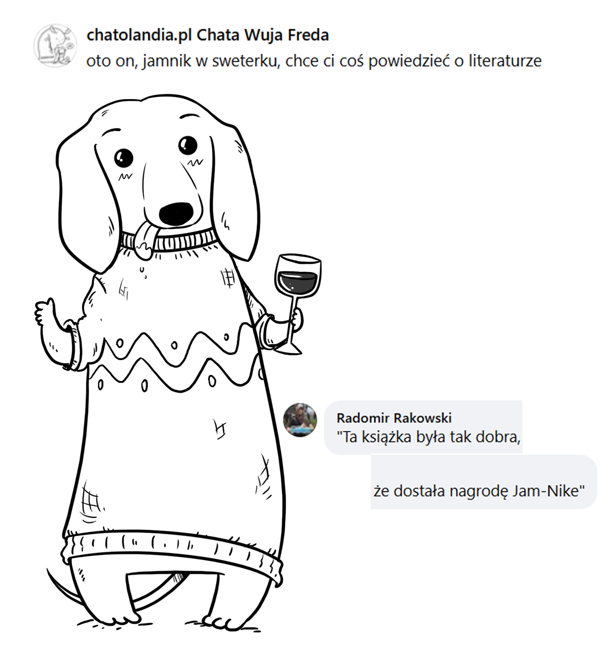 Ostatnio na chatolandia grupa wyparcia robię sobie jakieś losowe szkice codziennie i ludzie komentują i czasem to są takie perły, że aż postanowiłam jedną zobrazkować (za zgodą komentującego). Czy to będzie seria? Być może. Czy nagroda Jam-Nike powinna istnieć naprawdę? Tak. Może za dzieła długie i pocieszne.